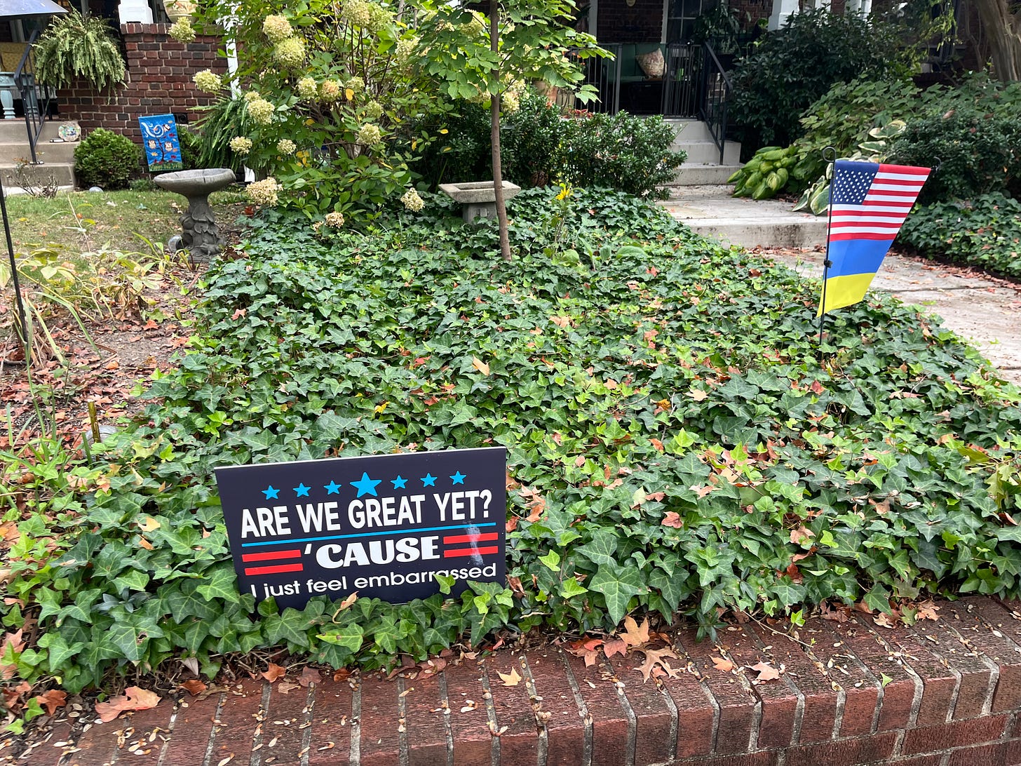 Halloween is approaching and many suburban houses have an almost absurd level of decoration outside, not just pumpkins but graveyards and 10 ft skeletons; there has been something of an arms race in this area, and we’re still a little behind. Almost as prominent are political signs outside people’s homes: pride flags, ‘immigrants are welcome here’ signs, and anti-Trump messages.