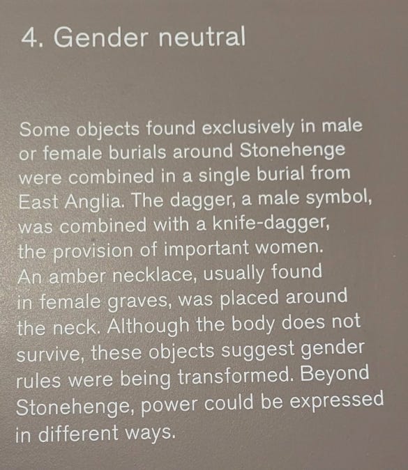 The British Museum’s Stonehenge exhibition fell for the temptation of applying 21st century concepts about gender to the 21st century BC. I have no idea what people at the time believed - none of us do - but I strongly suspect that the Neolithic Farmers of ancient Britain did not have had any conception of ‘gender neutral’, anymore than Viking women buried with their husband’s swords were actually trans. It seems like an obvious case of applying modern political beliefs to vastly alien cultures, a failure of anthropology and a failure of imagination.