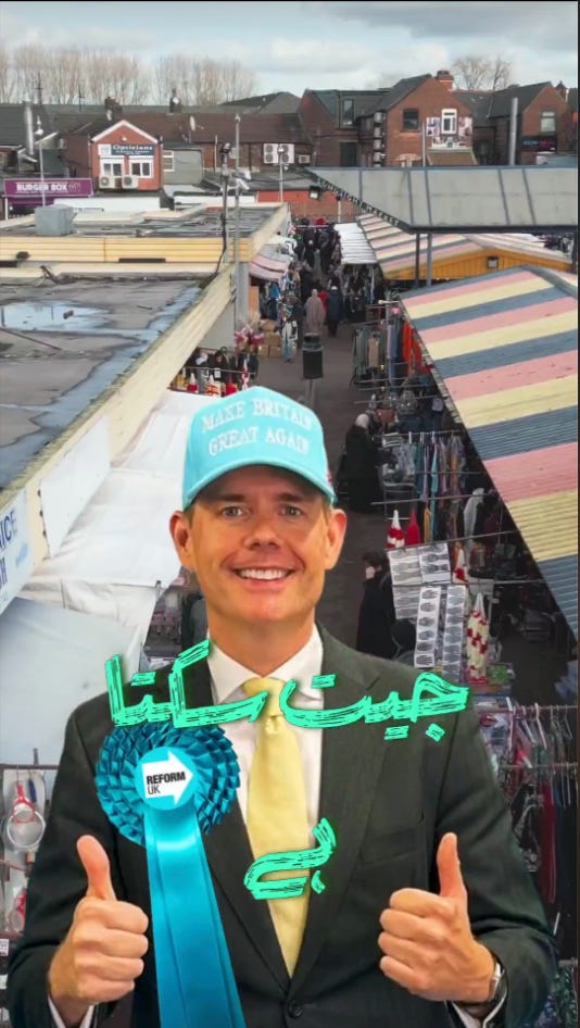 There was also an Urdu-language video linking Reform Party candidate Matt Goodwin and leader Nigel Farage with Donald Trump and ICE deportation raids. The video then cuts to Gaza, before showing Keir Starmer beside India’s Narendra Modi. Subtle stuff.