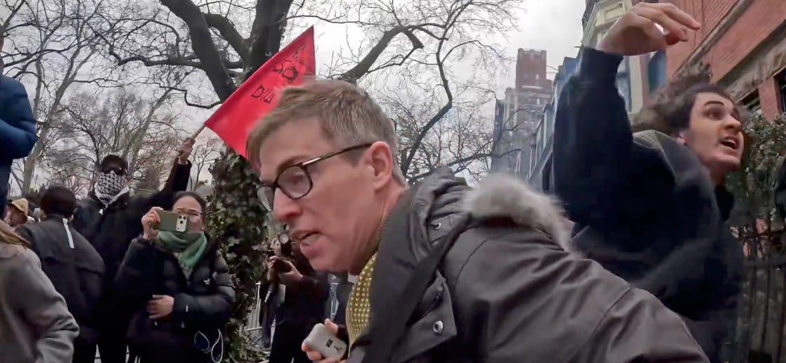 The incident occurred after a right-wing provocateur called Jake Lang organised a protest outside Gracie Mansion, the official residence of New York’s mayor, which was countered by a peaceful counterprotest. Just as a comedian/political activist called Walter Masterson was speaking through a megaphone about how immigrants are welcome in the city, two young men jumped up from behind him to hurl home-made explosives, filled with bolts and screws, at the anti-Islam protesters.