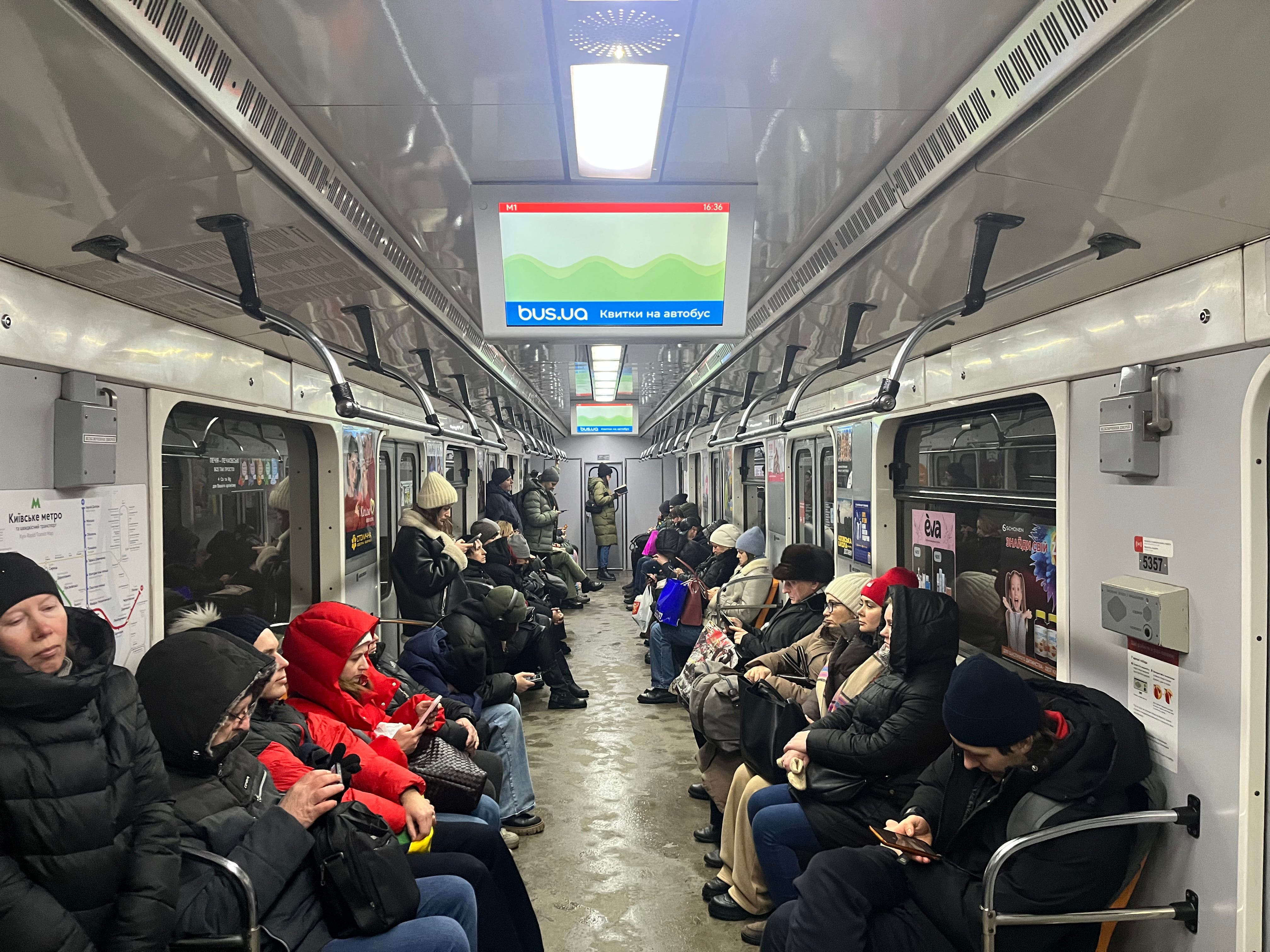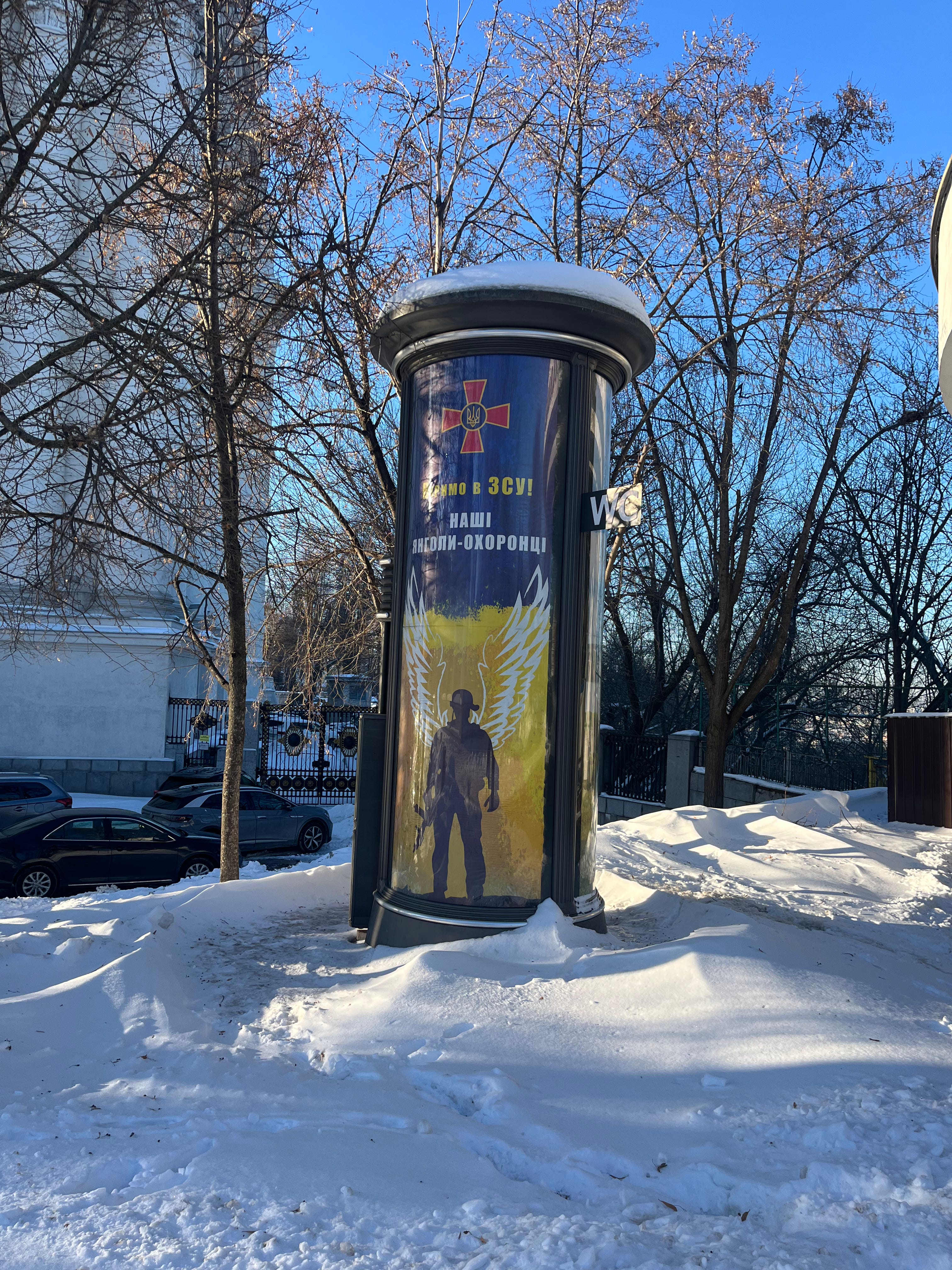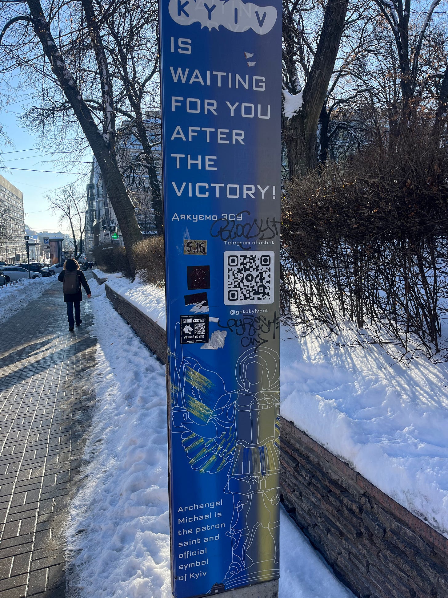 This combination of being in a modern European city amid signs of war typical of the mid-20th century is quite surreal. There are adverts for Minecraft or Valentine’s Day-related treats, and next to it a call to join the army – indeed everywhere there are appeals for men to join up, with different units competing to attract people. On the underground carriages, videos alternate between consumer goods and instruction videos telling people where to hide in the event of an attack. But it’s nothing like regions in the east of the country where the air-raid alarm sounds for 23 hours a day. It’s pretty normal.