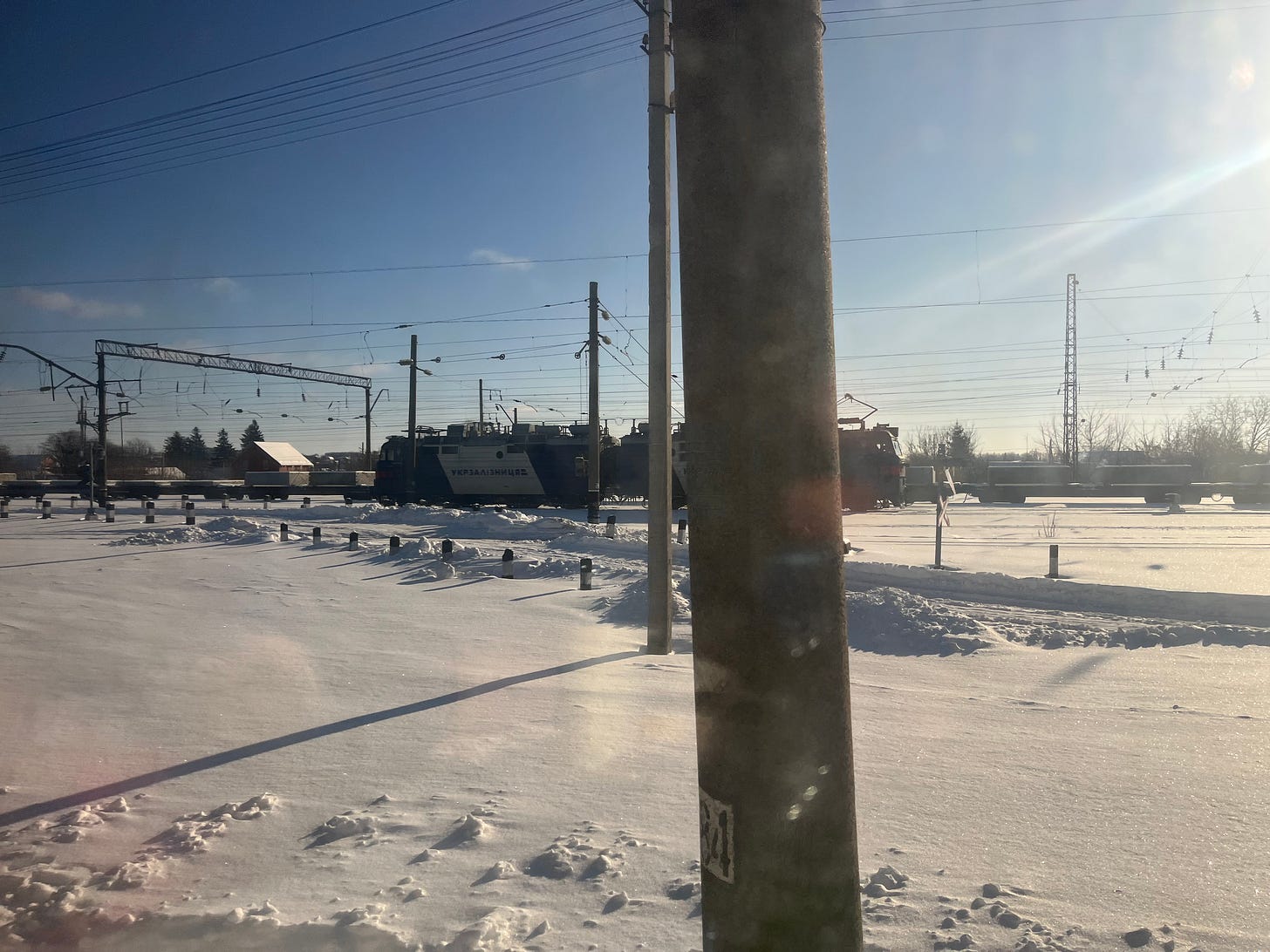 I eventually sleep, having an anxiety dream that we’d brought all the kids to Ukraine on holiday. When I look outside the window again it’s daylight, and the earth is blanketed in thick snow, which contrasts with the old black locomotives and industrial rolling stock by the side of the track. It feels very 20th century, in a bad way.