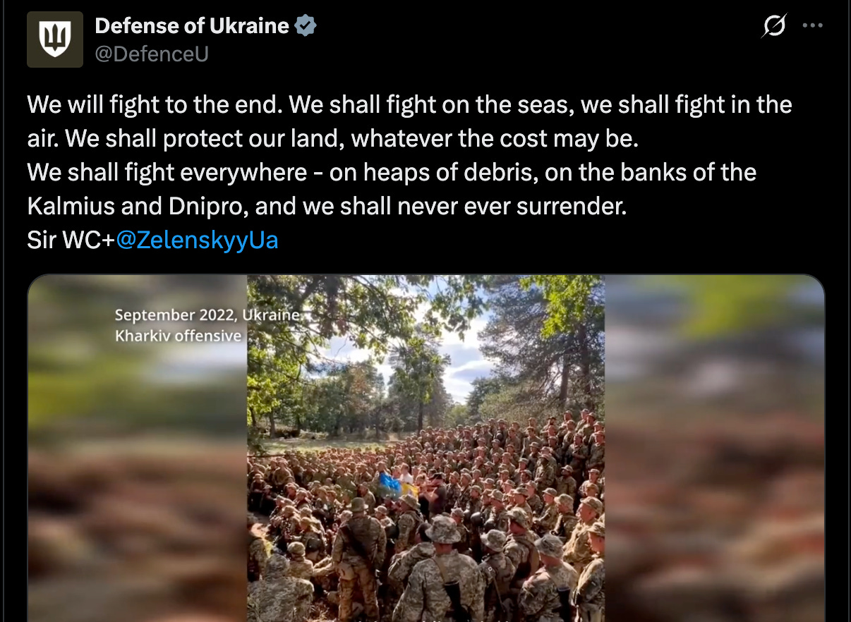 This national spirit has been demonstrated by Volodymyr Zelensky’s ‘without you’ speech, by the sight of victorious Ukrainian soldiers singing together their national hymn, and by their tributes to Winston Churchill, the embodiment of national defiance.